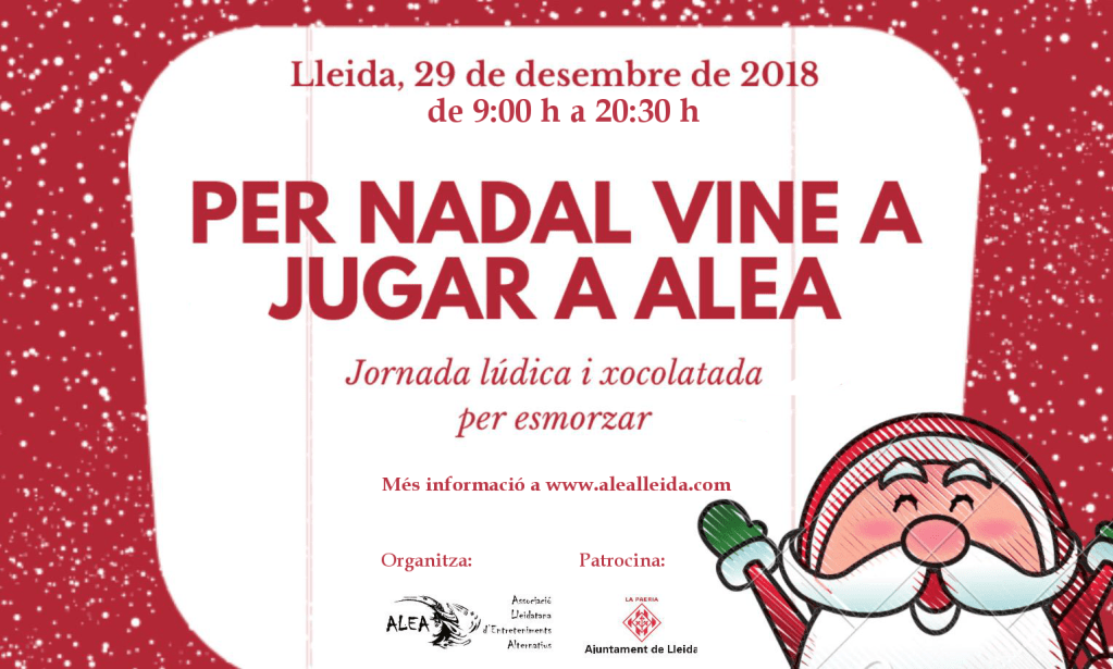 El dissabte 29 de desembre de 2018 vine al nostre local (C. Vallcalent 9, baixos) de 9h a 20.30h i passa un dia diferent jugant a jocs de taula. Hi haurà xocolatada per esmorzar!