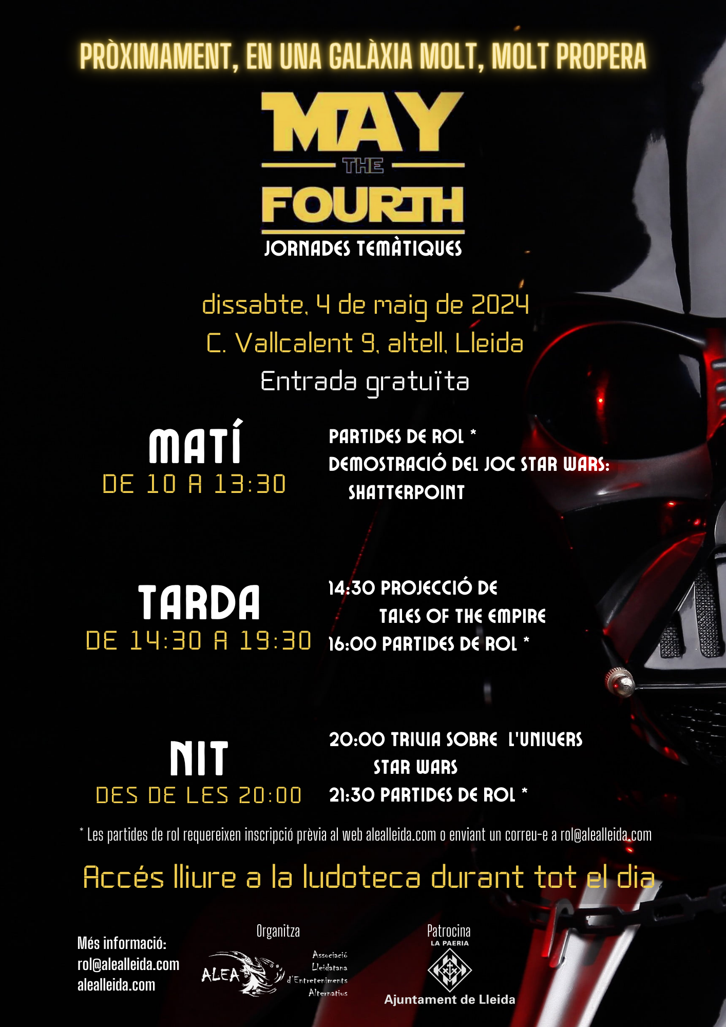 Com moltes ja sabreu el 04 de maig se celebra el dia internacional de Star Wars i a Alea Lleida ens apuntem a celebrar-lo amb un dia ple d’activitats, ja sigui rol, el visionat d’alguna sèrie, amb un trivial i amb alguna demostració del seu wargame més nou, Star Wars Shatterpoint.